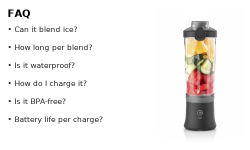 Perfect for travel or office use. The battery lasts long and blends frozen fruit with no problem.